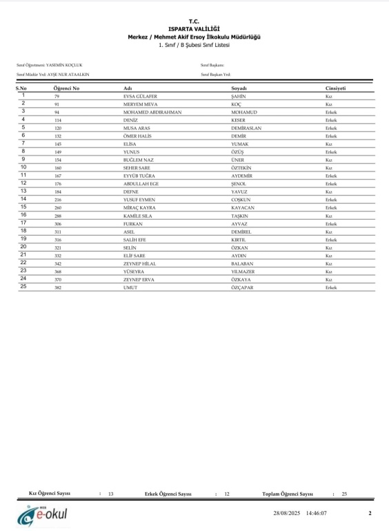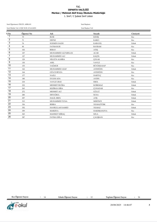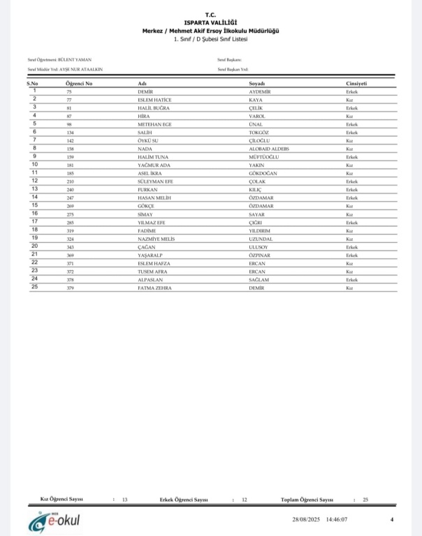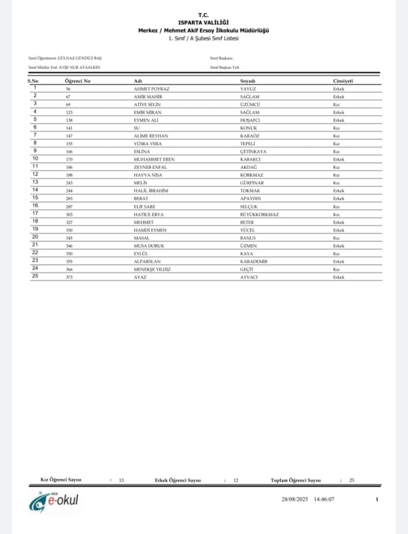 1. SINIF KURA SONUCU SINIF VE ÖĞRENCİ LİSTELERİ