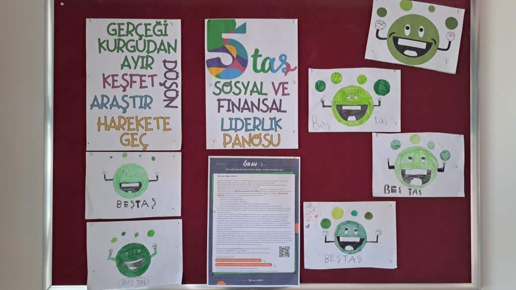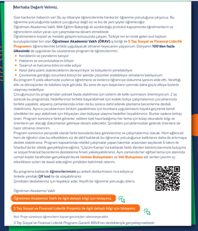 Öğretmen Akademisi Vakfı (ÖRAV) tarafından geliştirilen “5 TAŞ SOSYAL VE FİNANSAL LİDERLİK “ PROJESİNİN paydaşı olan Okulumuz , öğrencilerimizin sosyal becerilerini geliştirmeyi, finansal okuryazarlık konusunda farkındalık kazanmalarını sağlamayı ve onları geleceğe daha donanımlı bireyler olarak yetiştirmek için , etkinlikler yapılacaktır.